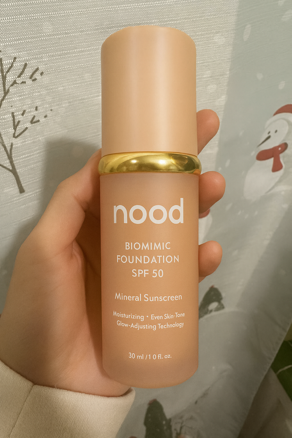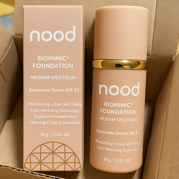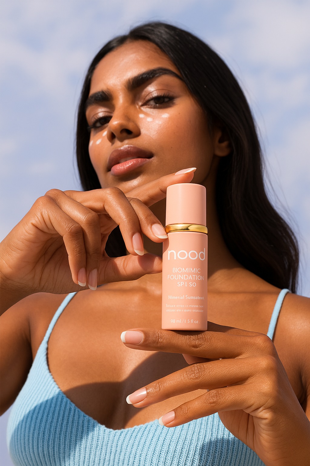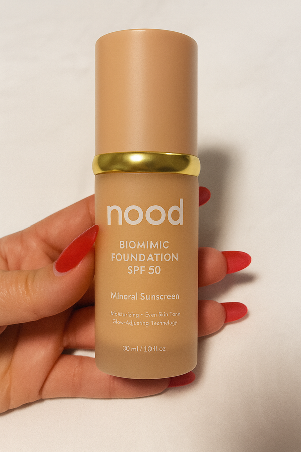 Nood Biomimic Foundation SPF 50 offers buildable medium coverage. You can apply a thin layer for a natural “your skin but better” look, or build it up for more coverage without caking.
