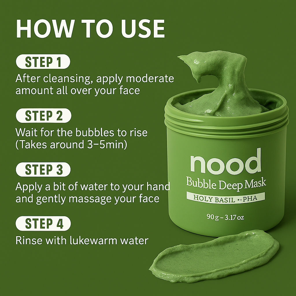 Revive your skin with the Nood Bubble Deep Mask. Infused with Holy Basil and PHA, it gently detoxifies, clears impurities, and hydrates deeply—leaving your complexion smoother, refreshed, and glowing with every use.